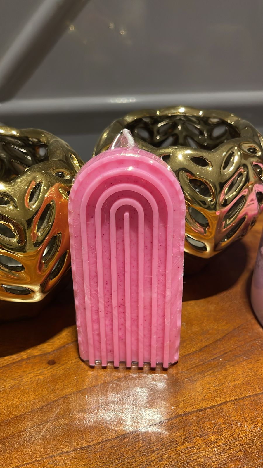 A curve of modern charm – uniquely shaped with a playful rainbow design in a beautiful shade of pink. Perfect for adding a trendy, artistic touch to your decor.